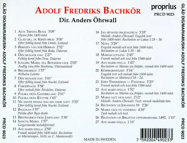 Swedish choir established in 1964 by Anders Öhrwall, active in Adolf Fredriks Kyrka in Stockholm until 1999, specialising in baroque music. Changed its name to Bachkören on leaving Adolf Fredrik. From 2003 to 2006 the choir resided in the Sundbyberg parish near Stockholm. For a bri...