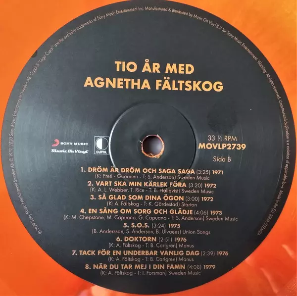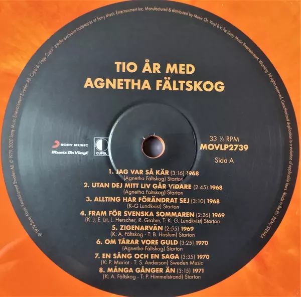 "Tio År Med Agnetha" (Ten Years with Agnetha) is a 1979 compilation album by Swedish pop singer Agnetha Fältskog, one of the voices of ABBA, which contains the most successful Swedish solo recordings she released during her career. It includes her Swedish version of ABBA's worldwide hit "SOS". The album closes with the brilliant 1979 ballad "Nar...