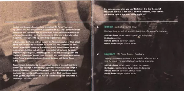 Ali Farka Toure a Ry Cooder se znali a oceňovali již dlouho předtím, než se v roce 1992 v Londýně poprvé setkali. A jak už to tak bývá, dohodli se, že "spolu něco udělají". V září 1993 se tímto "něčím" stalo album "Talking Timbuktu", klasika world music oceněná cenou Grammy, která se držela 31 týdnů na prvním místě v žebříčku world music. List "...