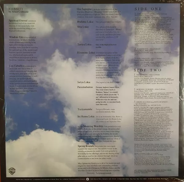 Alice Coltrane: Eternity versione su vinile LP in standard edizione. Questa particolare edizione è stata pubblicata in Germania nella casa editrice Warner Bros. Records in collaborazione con Speakers Corner Records in data 11. febbraio 2022. Album comprende generi Jazz, Fusion, Free Jazz e Modal. 180g High Quality Vinyl.