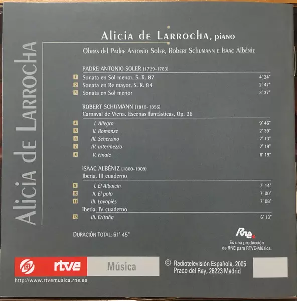 | Artista | Robert Schumann | Isaac Albéniz | Alicia De Larrocha | Padre Antonio Soler |
