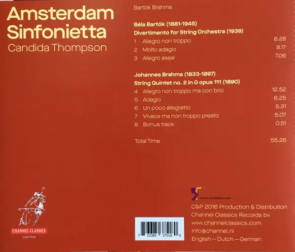| Artista | Johannes Brahms | Béla Bartók | Amsterdam Sinfonietta | Candida Thompson |