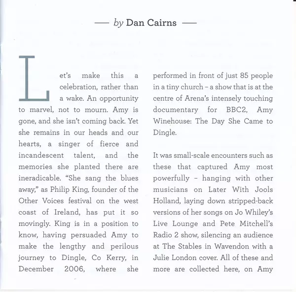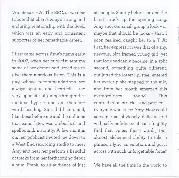 The late British singer Amy Winehouse is releasing a new box set, Amy Winehouse at the BBC, with proceeds going to the Amy Winehouse Foundation, which her family founded. This CD + DVD is its smaller, edition. featuring a selection of live tracks from various performances for the BBC.
