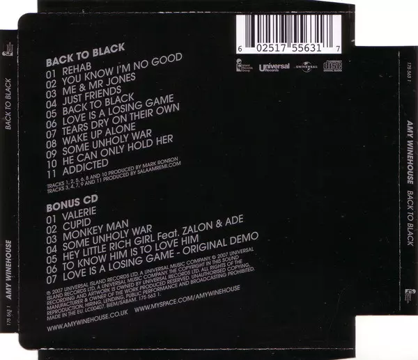 North London native Amy Winehouse rose to fame in October 2003, when she was 20 years old, with her globally acclaimed and platinum-selling debut album Frank. That record was her big and appropriately straight-talking break-up album, a little bitter at times but with a mature vocal that was never less than sweet.Frank won Amy over around the world and made her one of pop music's most distinctive new songwriters: confessional, vivacious and with a rare combination of humour and soul. With her debut, Amy struck at the core of people's lives, adding her own jazzy quirks to the legacy of the greats.Three years later, in October 2006, she followed it up with the stunning Back To Black, an album that took inspiration from the girl groups of her passion but, with a little help from producer Mark Ronson, brought her into the modern age. The album, on which Amy unabashedly confesses, charts her evolution from girl to woman, transforming her from critics' darling into a global pop phenomenon.The album, which is dominated by a stunning array of loosely interwoven funk tracks such as Rehab, You Know I'm No Good and Back To Black, has earned her countless awards including Brit Awards, Ivor Novellos and a whopping five Grammys. She also became one of the few British artists to sell more than 10 million copies of her album. (amywinehouse.com) Now the hit single "Back To Black" is also being released in an exclusive Deluxe Edition. The double-CD set comes in a Super Jewel Box and features seven bonus tracks - including previously unreleased studio and live material. North London-based Amy Winehouse first rose to fame in October 2003, when she was 20 years old, with her widely acclaimed and platinum-selling debut Frank. That record was her grand and appropriately straight-talking break-up record, sometimes a little bitter, with a mature vocal delivery that was never less than sweet. Frank won Amy a battalion of fans around the world and set her out as one of pop's most distinctive new songstresses; confessional, vivacious and with that rarest of combinations: humour and soul. With her debut, Amy tapped into the essence of being human and added her own jazzy wit to the legacy of the greats. Three years later, in October 2006, she followed it up with the stunning Back To Black, which took inspiration from the girl groups of her imagination but, with a little help from producer Mark Ronson, placed them in the midst of modernity. If that album charted Amy's evolution from girlhood to womanhood, it also propelled her from critics' darling to a true global pop phenomenon. Propelled by a stunning array of loosely interwoven, funk-inspired tracks including Rehab, You Know I'm No Good and Back To Black, the album won Amy countless awards, including Brit Awards, Ivor Novellos and a whopping five Grammys. She has also become one of a very select group of British artists to have sold over 10 million copies of an album. (amywinehouse. com)