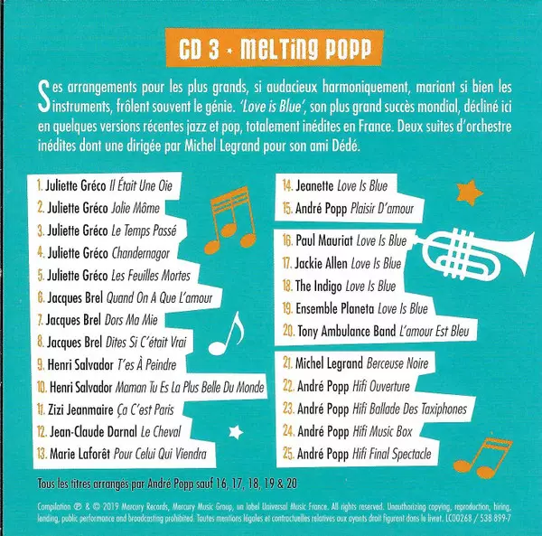 | CD 3: Melting Popp (Orchestrations Haute-Couture, Inédits Et "Love Is Blue" 50th) | |||