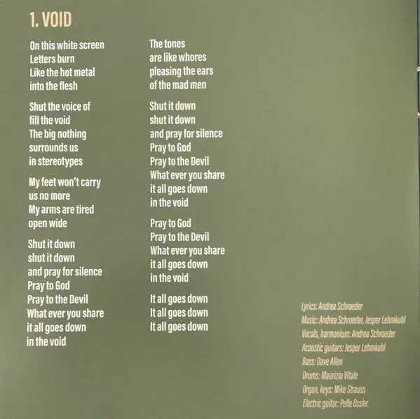 Acoustic Guitar, Music By Jesper Lehmkuhl | Bass Dave Allen (24) | Drums Maurizio Vitale | Electric Guitar Pelle Ossler | Lyrics By, Music By, Vocals, Harmonium Andrea Schroeder | Organ, Keyboards Mike Strauß