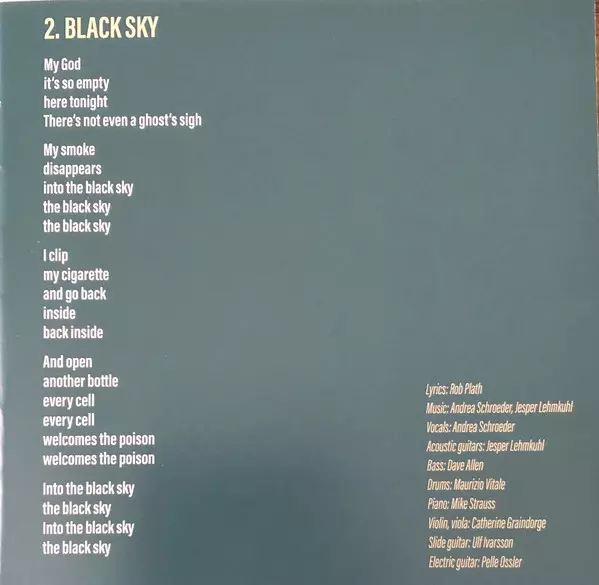 Bass Dave Allen (24) | Drums Maurizio Vitale | Effects Ulf Ivarsson | Lyrics By, Vocals, Music By Andrea Schroeder | Music By, Guitar Jesper Lehmkuhl | Piano Mike Strauß | Viola, Violin Catherine Graindorge