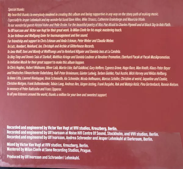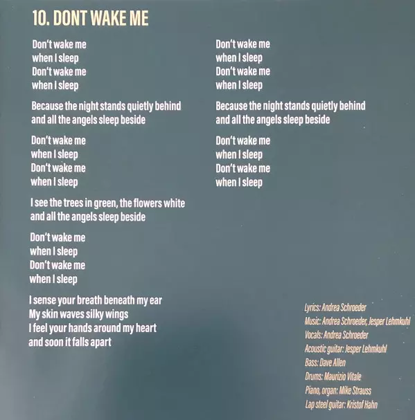 Bass Dave Allen (24) | Drums Maurizio Vitale | Electric Guitar Pelle Ossler | Lap Steel Guitar Kristof Hahn | Music By, Electric Guitar Jesper Lehmkuhl | Piano Mike Strauß | Vocals, Music By, Lyrics By Andrea Schroeder