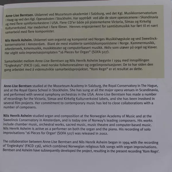 | Artista | Nils Henrik Asheim | Anne-Lise Berntsen |