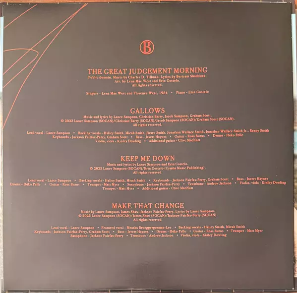 Backing Vocals Mahalia Smith, Micah Smith (6) | Bass Javert Haynes | Drums Ibiko Pelle | Featuring Measha Brueggergosman | Guitar Ross Burns | Keyboards Graham Scott (4), Jackson Fairfax-Perry | Lead Vocals Lance Sampson | Lyrics By Lance Sampson | Music By Jackson Fairfax-Perry, James Shaw (12), Lance Sampson | Saxophone Jackson Fairfax-Perry | Trombone Andrew Jackson (18) | Trumpet Matt Myer (2) | Violin, Viola Kinley Dowling | Vocals [Featured Vocal] Measha Brueggergosman