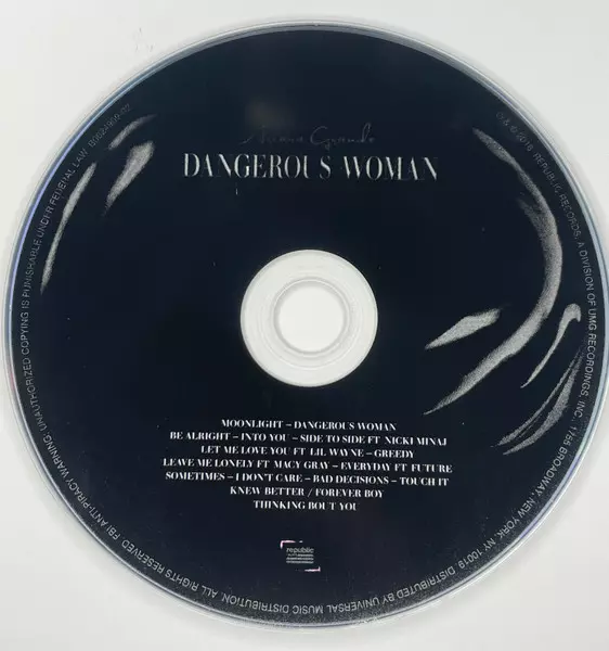 Ariana Grande: Dangerous Woman versione su CD in standard edizione. Questa particolare edizione è stata pubblicata in Stati Uniti nella casa editrice Republic Records in data 20. maggio 2016.
