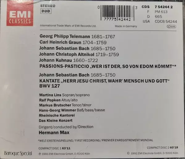 | Artista | Johann Sebastian Bach | Georg Philipp Telemann | Carl Heinrich Graun | Rheinische Kantorei | Das Kleine Konzert | Hermann Max | Johann Christoph Altnickol |