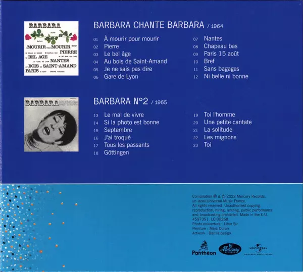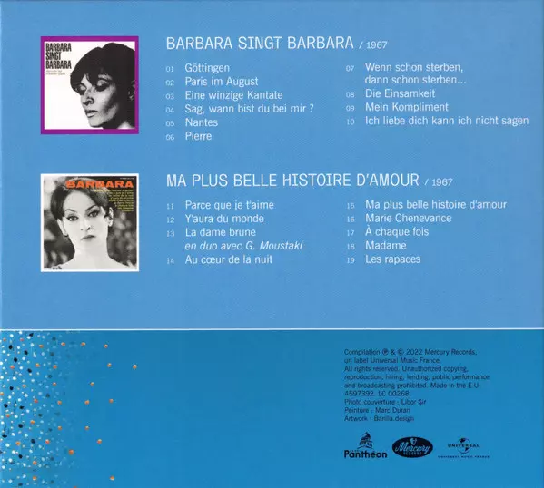 Barbara: Barbara (Intégrale De La Discographie Officielle Studio Et Live) DLX | LTD | NUM versione su 29CD/Set di cofanetti in deluxe limitati numerati individualmente rimasterizzati edizione. Questa particolare edizione è stata pubblicata in Francia nella casa editrice Label Panthéon in collaborazione con Mercury e Universal Music France in data 9. dicembre 2022. Album comprende generi Pop e Chanson. Numbered Deluxe Limited Edition.