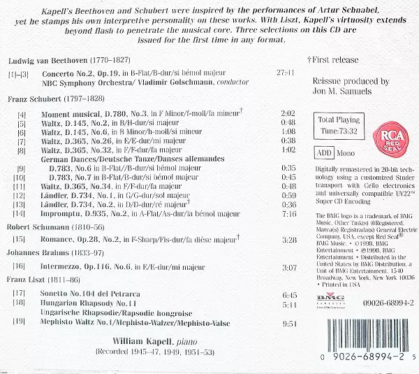 | Artista | Ludwig van Beethoven | Johannes Brahms | Franz Schubert | Franz Liszt | Robert Schumann | William Kapell |