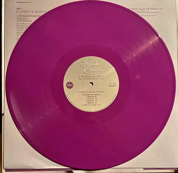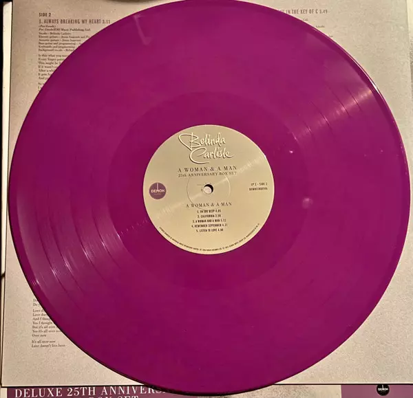 Belinda Carlisle: A Woman & A Man DLX | LTD | CLR versione su vinile 3LP/Set di cofanetti in deluxe limitati colorati edizione. Questa particolare edizione è stata pubblicata in Europa nella casa editrice Demon Records in data 12. luglio 2022. Album comprende generi Rock, Pop, Vocale, Ballata e Pop Rock. High Quality 25th Anniversary Coloured Purple 180g Vinyl Deluxe Limited Edition.