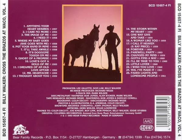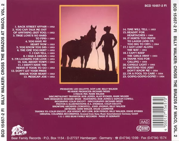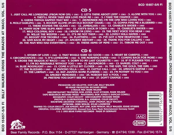 Billy Walker: Cross The Brazos At Waco versione su 6CD/Set di cofanetti in rimasterizzati edizione. Questa particolare edizione è stata pubblicata in Germania nella casa editrice Bear Family Records anno 2000. Album comprende generi Folk, World, & Country e Country.