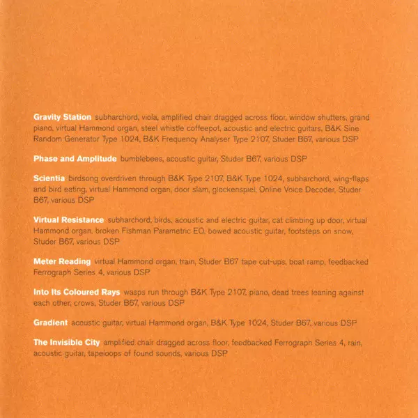 Effects [Birdsong Feed-backed And Overdriven Through A B&k Frequency Analyzer Type 2107], Electronics [B&k Type 1024], Electronics [Subharchord], Recorded By [Wing Flaps And Birds Eating, Door Slam], Computer [Virtual Hammond Organ], Glockenspiel, Computer [Online Voice Decoder], Tape [Studer B67], Effects [Various Dsps] BJNilsen