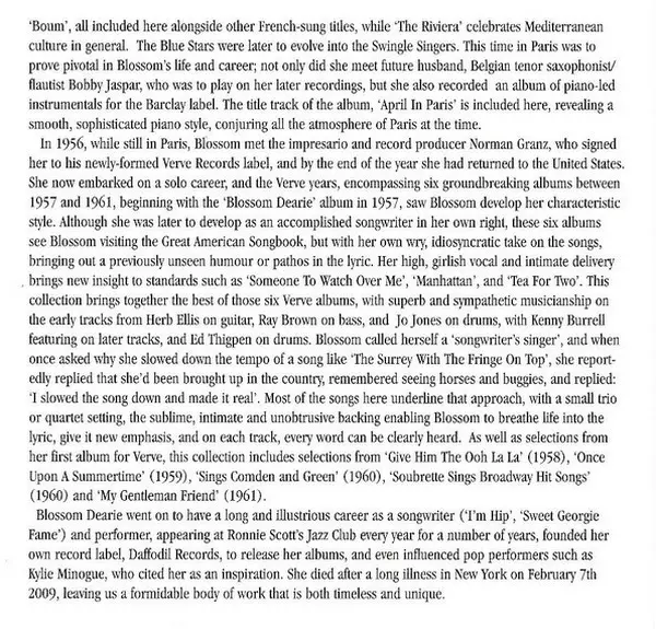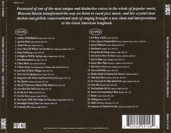 Blossom Dearie: The Essential Recordings versione su 2CD in rimasterizzati edizione. Questa particolare edizione è stata pubblicata in REGNO UNITO nella casa editrice Primo (2) in data 28. agosto 2014. Album comprende generi Pop, Jazz, Vocale, Musica di facile ascolto e Swing.