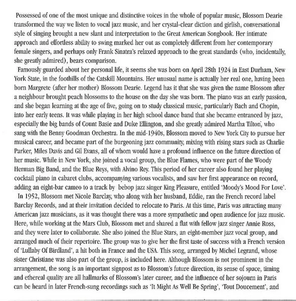 Blossom Dearie was an American jazz singer and pianist known for her distinctive, light and girlish voice. Born on April 28, 1924, in East Durham, New York, she began her career in post-war Europe with the vocal group The Blue Flames, associated with the Woody Herman band, before f...