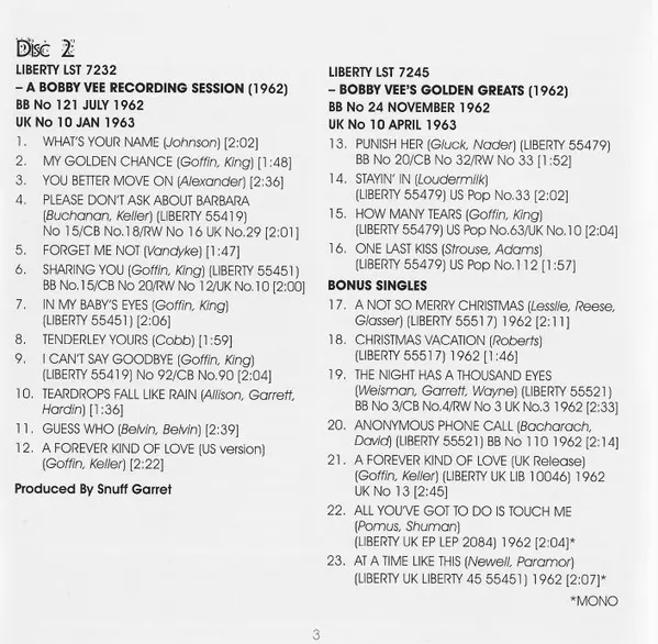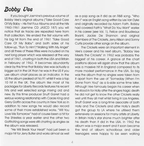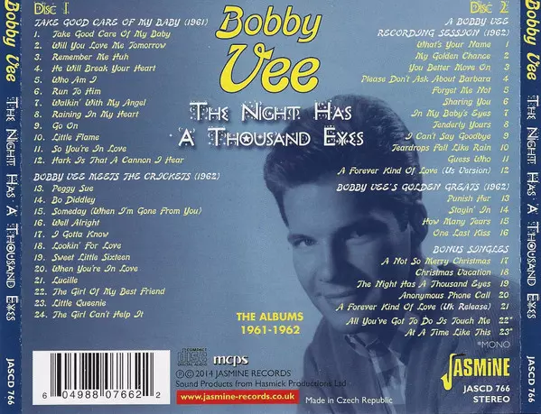 Bobby Vee: The Night Has A Thousand Eyes (The Albums 1961-1962) versione su 2CD in standard edizione. Questa particolare edizione è stata pubblicata in REGNO UNITO nella casa editrice Jasmine Records in data 29. aprile 2014. Album comprende generi Rock, Pop e Classic Rock.
