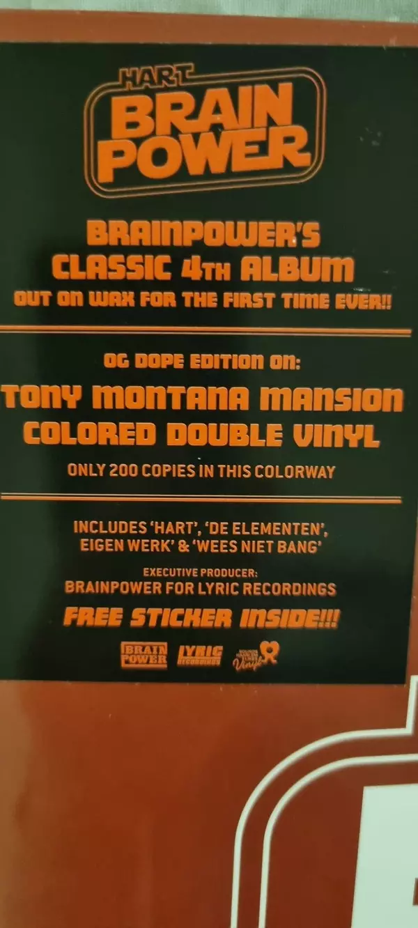 Brainpower: Hart LTD versione su vinile 2LP in limitati edizione. Questa particolare edizione è stata pubblicata in Paesi Bassi nella casa editrice Lyric Recordings in collaborazione con Sounds Haarlem Likes Vinyl in data 23. aprile 2022. Album può essere classificato come un genere Hip Hop. Tony Montana Mansion Coloured Vinyl Limited Edition.