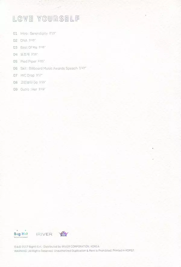 BTS: Love Yourself 承 'Her' versione su CD in standard edizione. Questa particolare edizione è stata pubblicata in Corea del Sud nella casa editrice Big Hit Entertainment in data 19. settembre 2017.