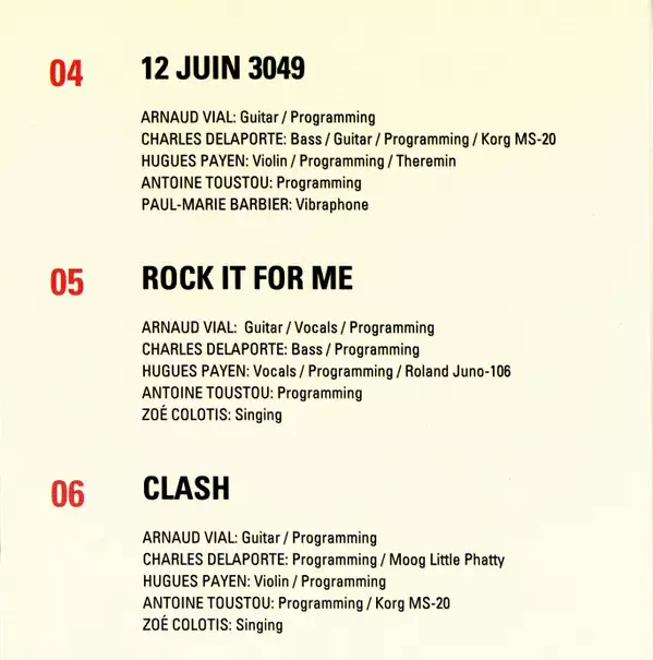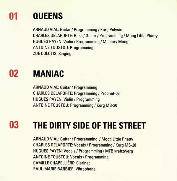Guitar, Bass [Programming, Korg Monopoly] Arnaud Vial | Programmed By [Programming, Korg Ms-20] Charles Delaporte | Programmed By [Programming] Antoine Toustou | Vibraphone Paul-Marie Barbier | Violin [Programming, Korg Vc-10] Hugues Payen