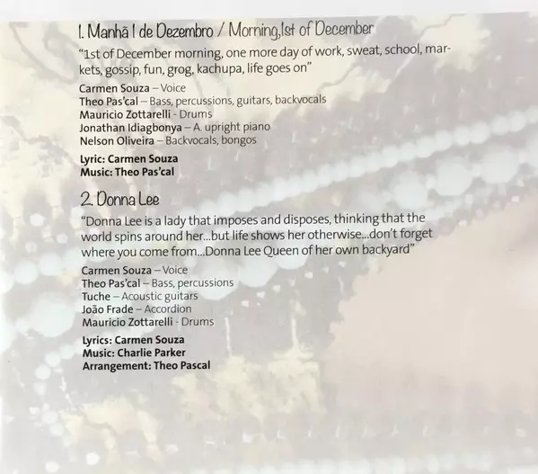 Backing Vocals Nelson Oliveira (2) | Double Bass, Acoustic Guitar, Percussion, Backing Vocals Theo Pas'cal | Flute Guto Lucena | Lyrics By Carmen Souza | Music By Theo Pas'cal | Percussion Zoe Pas'cal | Voice Carmen Souza