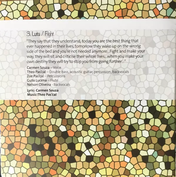 Bass, Percussion Theo Pas'cal | Drums Mauricio Zottarelli | Lyrics By Carmen Souza | Music By Theo Pas'cal | Tenor Saxophone Guto Lucena | Voice, Acoustic Guitar Carmen Souza