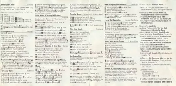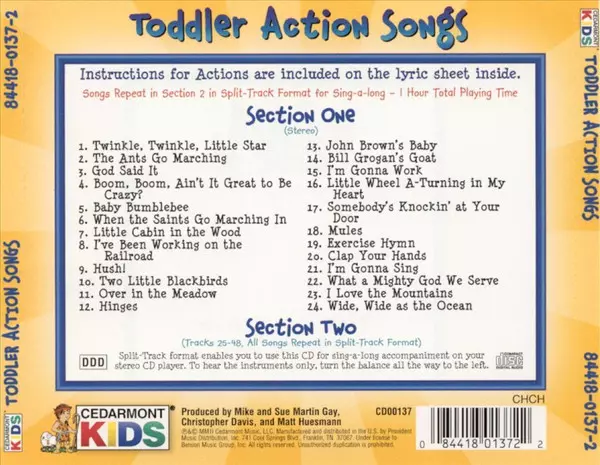 Cedarmont Kids: Toddler Action Songs versione su CD in standard edizione. Questa particolare edizione è stata pubblicata in Stati Uniti nella casa editrice Cedarmont Music in data 5. marzo 2002. Album comprende generi Pop, Folk, World, & Country, I bambini e Nursery Rhymes.