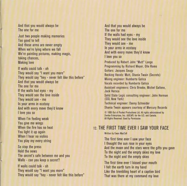 Backing Vocals Robert John Lange, Shania Twain | Engineer [Assistant] Chris Brooke, Jack Hersca, Michel Gallone | Engineer [Mixed] Humberto Gatica | Guitar Jacques Saugy | Producer Robert John Lange | Programmed By Olle Romo, Richard Meyer (4) | Recorded By [Lead Vocals] Humberto Gatica | Written-By Robert John Lange