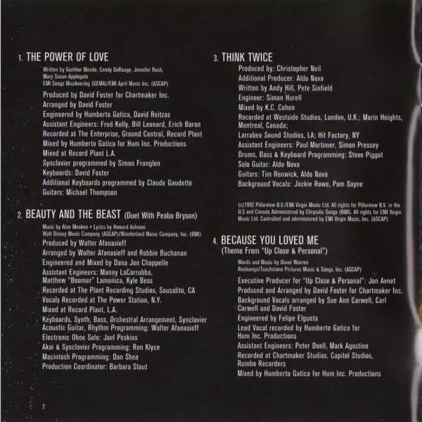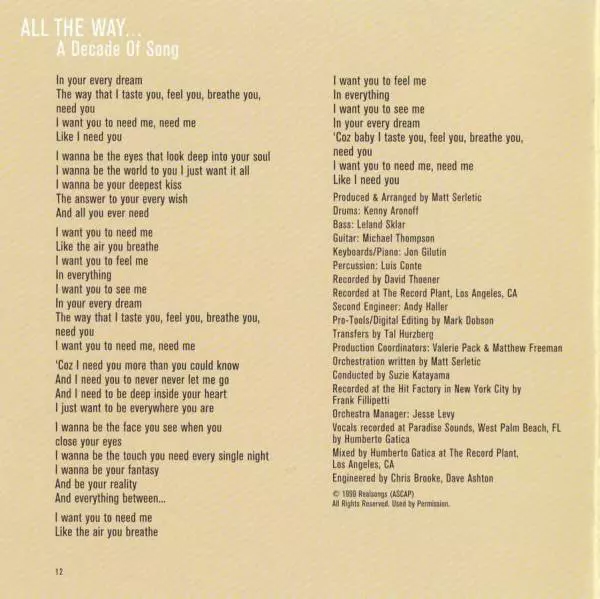 Arranged By David Foster | Arranged By [Backing Vocals] Carl Carwell, David Foster, Sue Ann Carwell | Backing Vocals Alanna Capps, Alex Brown, Bridgette Bryant, Carl Carwell, Kofi, Maxayn Lewis, Phillip Ingram, Terry Bradford, Will Wheaton | Engineer Felipe Elgueta | Engineer [Assistant] Mark Agostino, Peter Doell | Executive-Producer [For Up Close & Personal] Jon Avnet | Guitar Michael Thompson | Keyboards David Foster | Mixed By Humberto Gatica | Mixed By [Assistant] Chris Brooke, Kyle Bess, Paul Boutin | Producer David Foster | Programmed By [Synclavier] Simon Franglen | Recorded By [Lead Vocal] Humberto Gatica | Written-By Diane Warren