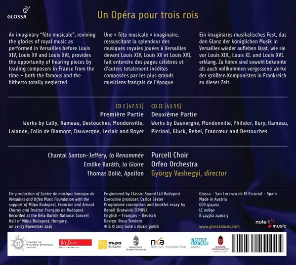 Emöke Barath: Un Opéra Pour Trois Rois: A Versailles Entertainment For Louis XIV, XV, XVI versione su 2CD in standard edizione. Questa particolare edizione è stata pubblicata in Europa nella casa editrice Glossa in data 6. ottobre 2017. Album comprende generi Musica classica, Musica barocca, Opera e Choral.