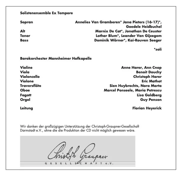| Artista | Christoph Graupner | Florian Heyerick | Ex Tempore | Mannheimer Hofkapelle |