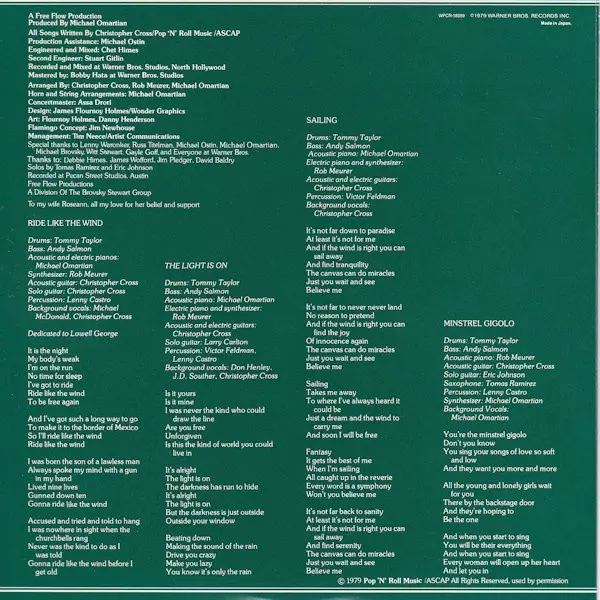 Acoustic Guitar, Electric Guitar Christopher Cross | Backing Vocals Christopher Cross, Don Henley, John David Souther | Bass Andy Salmon | Drums Tommy Taylor | Electric Piano, Synthesizer Rob Meurer | Guitar, Soloist Larry Carlton | Percussion Lenny Castro, Victor Feldman | Piano [Acoustic Piano] Michael Omartian