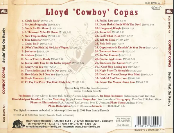 Cowboy Copas: Settin' Flat On Ready versione su CD in standard edizione. Questa particolare edizione è stata pubblicata in Germania nella casa editrice Bear Family Records in data 20. marzo 2008. Album comprende generi Rock, Folk, World, & Country, Country, Rockabilly e Honky Tonk.