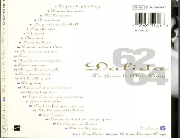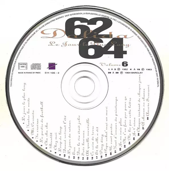 Dalida: Le Jour Le Plus Long - Volume 6 versione su CD in standard edizione. Questa particolare edizione è stata pubblicata in Francia nella casa editrice Barclay in data 30. giugno 1998. Album comprende generi Pop, Vocale e Chanson.