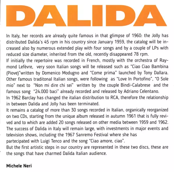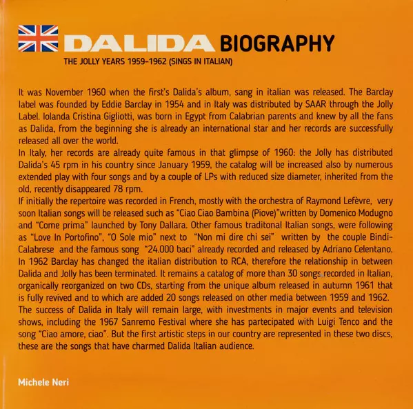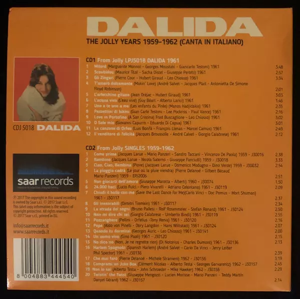 Dalida: The Jolly Years 1959/62 versione su 2CD in standard edizione. Questa particolare edizione è stata pubblicata in Italia nella casa editrice Jolly in collaborazione con SAAR Records in data 3. febbraio 2017. Album comprende generi Pop, Vocale, Ballata e Chanson.