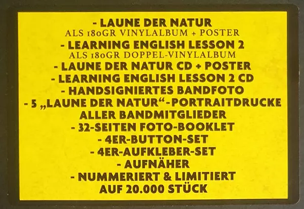 Die Toten Hosen: Laune Der Natur / Learning English Lesson 2 DLX | LTD | NUM | DIGI versione su vinile 3LP/2CD/Set di cofanetti in deluxe limitati numerati individualmente digipack edizione. Questa particolare edizione è stata pubblicata in Germania nella casa editrice Jochens Kleine Plattenfirma (JKP) in data 5. maggio 2017. Album comprende generi Rock e Punk. Numbered Digipack 180g Vinyl Deluxe Limited Edition.
