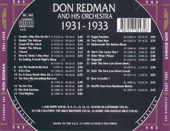 Don Redman And His Orchestra: 1931-1933 versione su CD in standard edizione. Questa particolare edizione è stata pubblicata in Francia nella casa editrice Classics (11) in data 19. novembre 1996. Album comprende generi Jazz, Big Band e Swing.