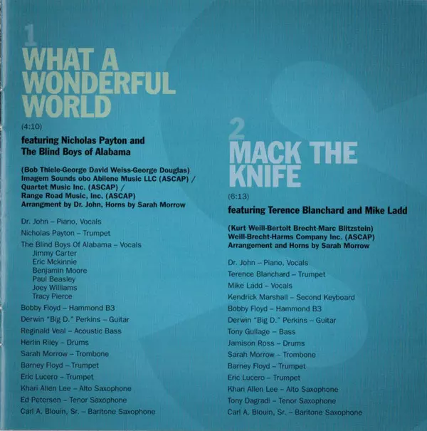 Alto Saxophone Khari Allen Lee | Arranged By Dr. John | Arranged By [Horns] Sarah Morrow | Baritone Saxophone Carl Blouin | Double Bass [Acoustic Bass] Reginald Veal | Drums Herlin Riley | Featuring, Trumpet Nicholas Payton | Featuring, Vocals The Blind Boys Of Alabama | Guitar Derwin Perkins | Organ [Hammod B3] Bobby Floyd | Piano, Vocals Dr. John | Recorded By [The Blind Boys Of Alabama, Assisted By] Yoichi Yamamoto (2) | Recorded By [The Blind Boys Of Alabama] Jeff Jones | Tenor Saxophone Ed Petersen | Trombone Sarah Morrow | Trumpet Barney Floyd, Eric Lucero | Vocals [The Blind Boys Of Alabama] Ben Moore (2), Jimmy Carter (4), Joey Williams, Paul Beasley, Ricky McKinnie, Tracy Pierce | Written-By Bob Thiele, George David Weiss, George Douglas