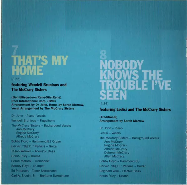 Arranged By Dr. John | Arranged By [Horns] Sarah Morrow | Arranged By [Vocals] The McCrary Sisters | Backing Vocals [The McCrary Sisters] Alfreda McCrary, Ann McCrary, Regina McCrary | Baritone Saxophone Carl Blouin | Double Bass [Acoustic Bass] Jason Weaver (6) | Drums Herlin Riley | Featuring, Backing Vocals The McCrary Sisters | Featuring, Flugelhorn Wendell Brunious | Guitar Derwin Perkins | Organ [Hammod B3] Bobby Floyd | Piano, Vocals Dr. John | Recorded By [The McCrary Sisters] Chad Brown | Tenor Saxophone Ed Petersen | Trombone Sarah Morrow | Trumpet Barney Floyd | Written-By Ben Ellison, Leon Rene, Otis Rene