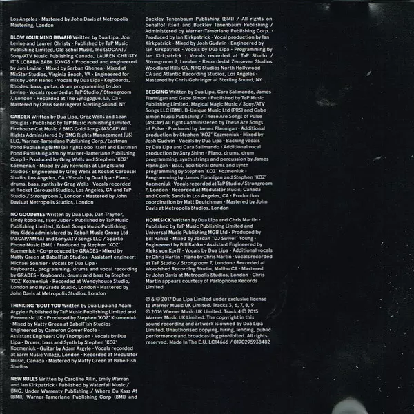 Bass, Drum Programming, Electric Piano [Rhodes], Engineer, Guitar, Keyboards, Producer Jon Levine | Engineer [For Mix] John Hanes | Mastered By Chris Gehringer | Mixed By Serban Ghenea | Vocals Dua Lipa | Written-By Dua Lipa, Jon Levine, Lauren Christy
