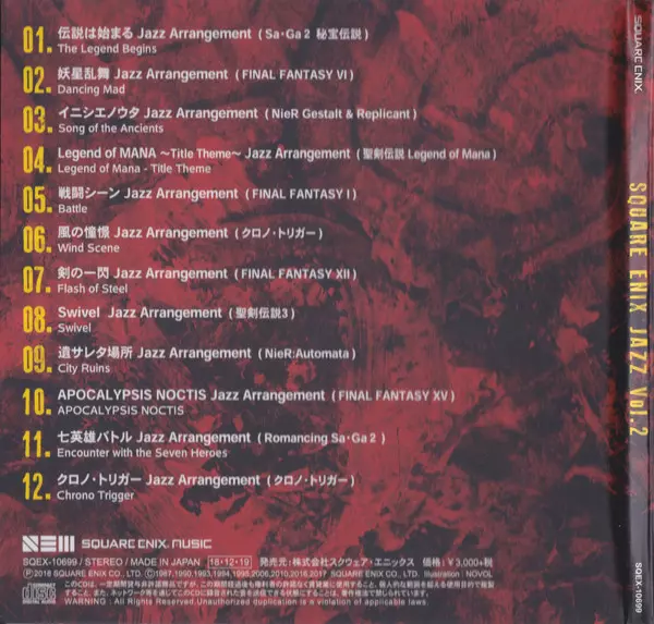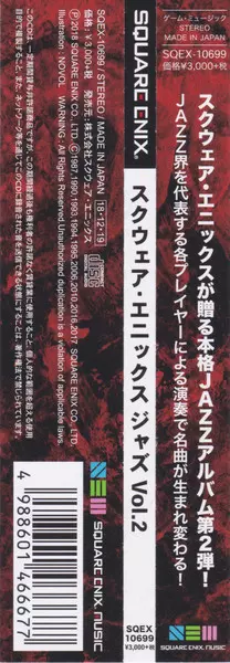 Ryu Kawamura: Square Enix Jazz Vol.2 = スクウェア・エニックス ジャズ Vol.2 versione su CD in standard edizione. Questa particolare edizione è stata pubblicata in Giappone nella casa editrice Square Enix Music in data 28. dicembre 2018. Album comprende generi Palcoscenico e schermo, Jazz, Soundtrack e Video Game Music.