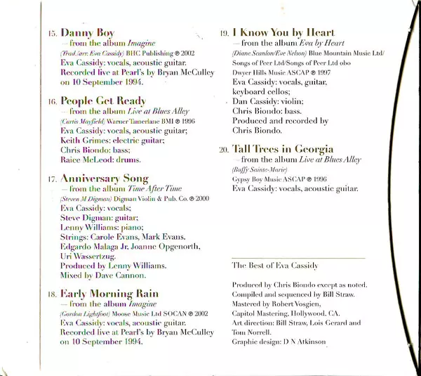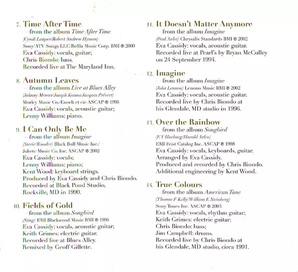 Arranged By [Piano And String Arrangement] Lenny Williams (2) | Producer Chris Biondo | Strings Carole Evans, Edgardo Malaga Jr., Jennifer Ries, Mark Evans (30), Mary Kim Walsh | Vocals, Guitar Eva Cassidy | Written-By Claire Hamill