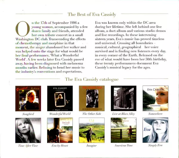 V den padesátých narozenin Evy Cassidy oznámila společnost Blix Street Records vydání nové obsáhlé kolekce "The Best Of Eva Cassidy", která obsahuje 20 nejoblíbenějších a nejúspěšnějších písní zesnulé zpěvačky.