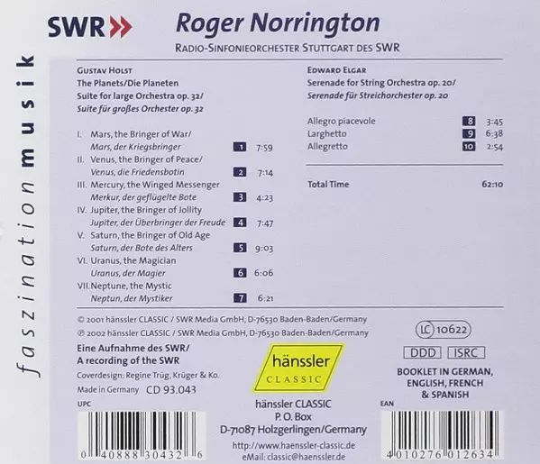 | Artista | Gustav Holst | Sir Edward Elgar | Radio-Sinfonieorchester Stuttgart | Roger Norrington |