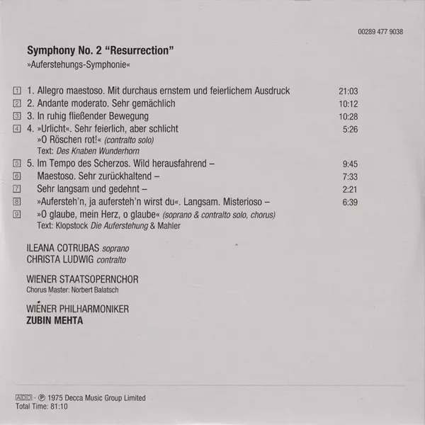 Chorus Wiener Staatsopernchor | Chorus Master Norbert Balatsch | Conductor Zubin Mehta | Contralto Vocals Christa Ludwig | Orchestra Wiener Philharmoniker | Soprano Vocals Ileana Cotrubas