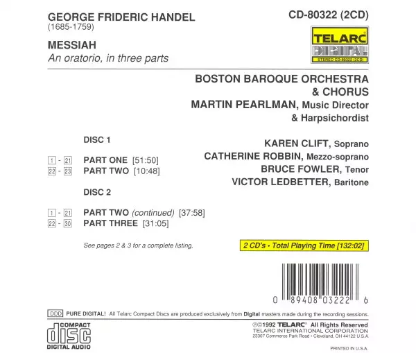 Georg Friedrich Händel: Messiah versione su 2CD in standard edizione. Questa particolare edizione è stata pubblicata in Stati Uniti nella casa editrice Telarc in data 24. novembre 1992. Album comprende generi Musica classica, Musica barocca e Oratorio.
