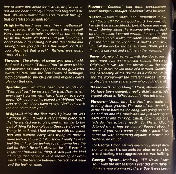 Bass Klaus Voormann | Drums Jim Gordon, Jim Keltner | Guitar Chris Spedding | Organ Roger Coulam | Piano, Vocals Harry Nilsson | Saxophone Bobby Keys | Trumpet, Trombone, Arranged By [Horns] Jim Price | Written-By Harry Nilsson